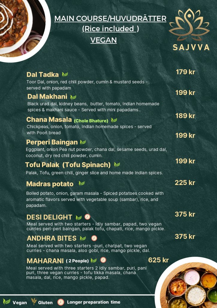 Meal served with three startes 2 idly sambar, puri, dabeli nachos, two vegan curries - tofu tikka masala, chana masala, dal, 2 rice, mango pickle, papad.
